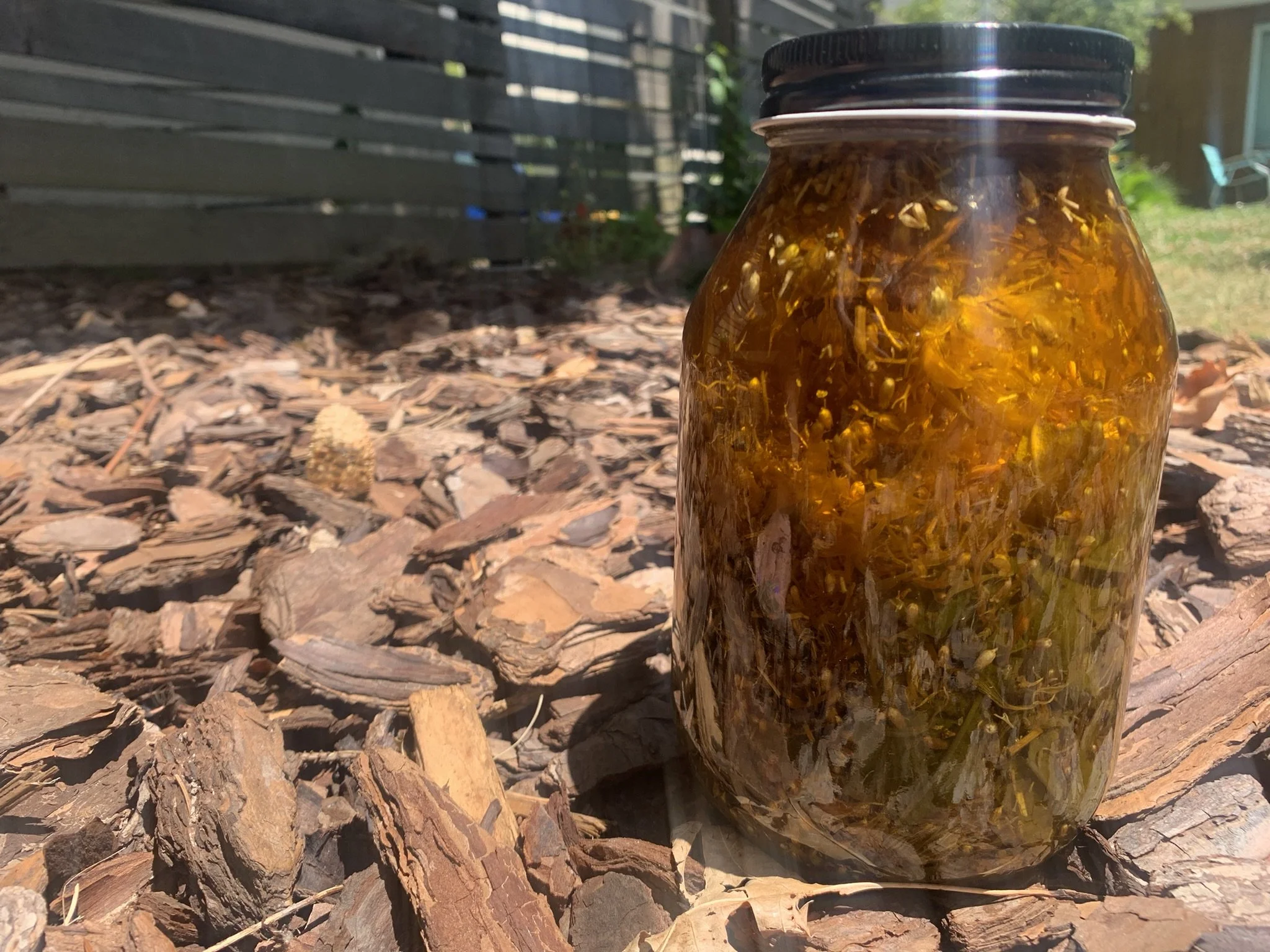 To begin, choose which herbs you want to include. I typically do equal parts of fresh or dried calendula, yarrow, and broadleaf plantain. I chop them into pieces and place them in a wide-mouth glass jar and fill it about 2/3 up. Cover the herbs with oil (I use olive oil), and make sure they are completely covered. Set the jar in a sunny spot and shake it every day or two. Around the 4-6 week mare your oil can be strained (I typically use double layered cheesecloth) and placed in a bottle. (This process can also be used for edible uses like rosemary garlic infused oil for cooking).