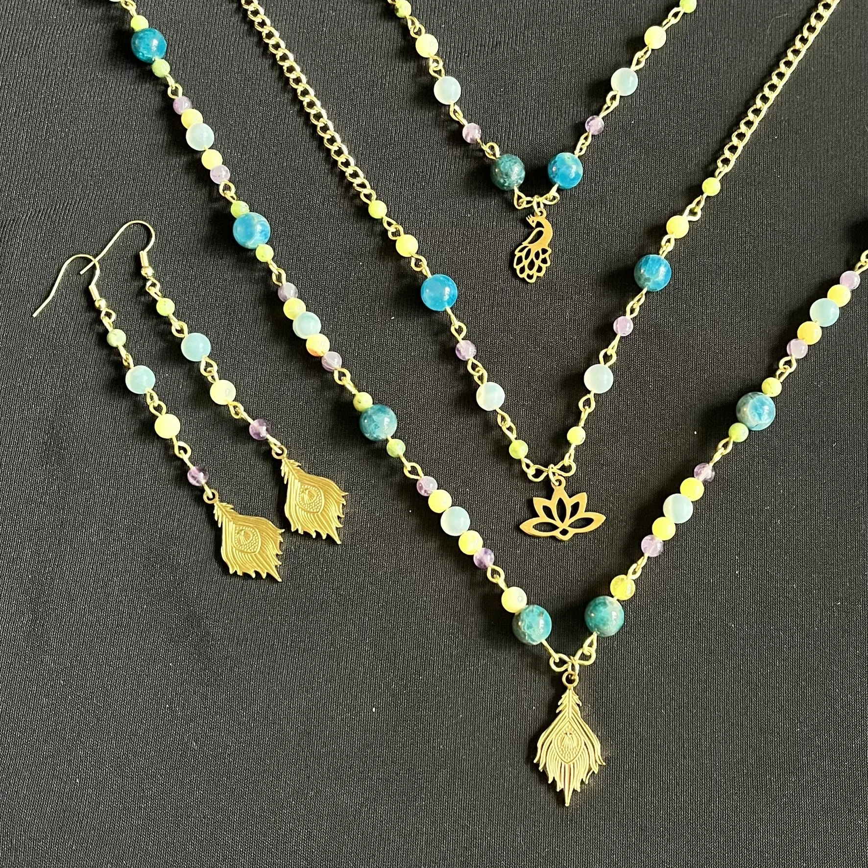 Beads of apatite (acceptance, curiosity, expression), amazonite (sincerity, honor, integruty), amethyst (serenity, calmness, insight), honey opal (passion, transformation, mindfulness) and green jade (prosperity, wellbeing, balance).