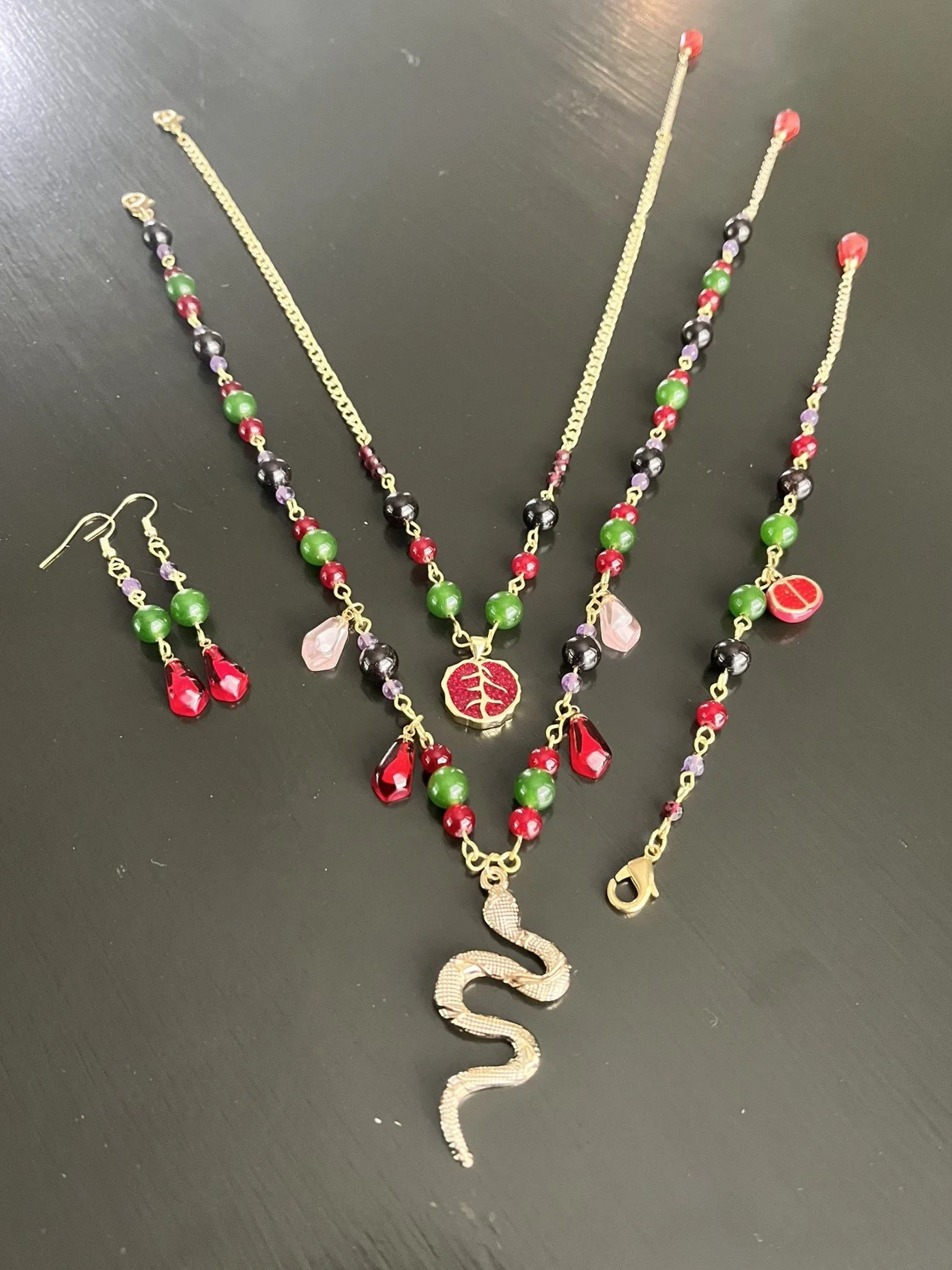 Charms are skulls, representing the symbol of death and the afterlife, snakes, a symbol of creative life force, rebirth, and transformation, and pomegranate seeds, representing fertility, and the fruit of the dead.